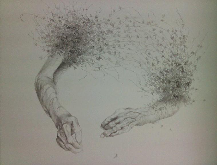 普段は割と長く構想をあたためるのだけど、「そうだ祖母の手を描かせてもらおう!」と思い立って翌日スケッチに行き、描き始めたら繁らせたくなって…