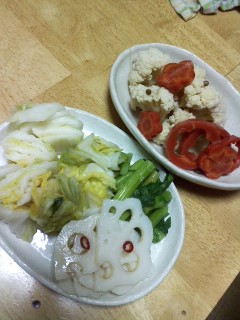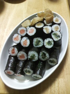 あと、漬物と酢蓮とピクルス、巻き寿司(鮭、干瓢、京菜漬) とか