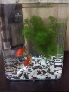 通販で初心者用水槽セット(樹脂水槽、蓋、水中フィルター、砂利、カルキ抜き、餌で1900円。この低価格で踏ん切りがついたよ)を購入し、近所のペット屋で水草(カモンバ。金魚にはこれ、てイメージなのです)を購入。