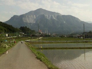 武甲山と水田と自転車少年と猫。